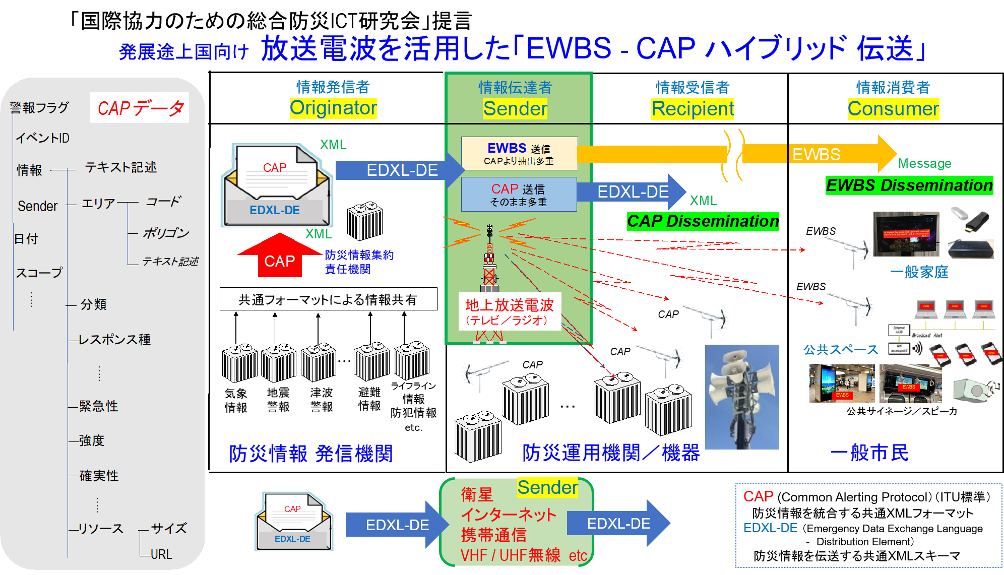近年、自然災害への迅速な対応が地球的課題となっている状況において、「国際協力のための総合防災ICT 研究会」(開催概要、構成員名簿参照)では、緊急警報放送システム(EWBS)を活用及び深化させた国際協力の在り方を議論し、早期に実装可能な総合防災ICTモデルとその海外展開の方策について検討を行いました。総合防災 ICT について川上から川下までのシステムとしてのモデルを示し、また「EWBS-CAPハイブリッド伝送方式」を地デジ日本方式(ISDB-T)採用国に提供するといった方法論、ローカライゼーションのあり方等の提言をとりまとめ、来年度以降における政府や関係者の取組についても具体的な提案を行いました。